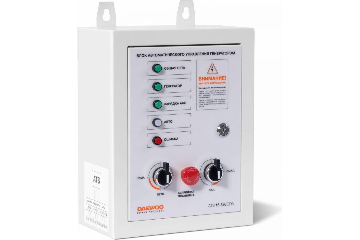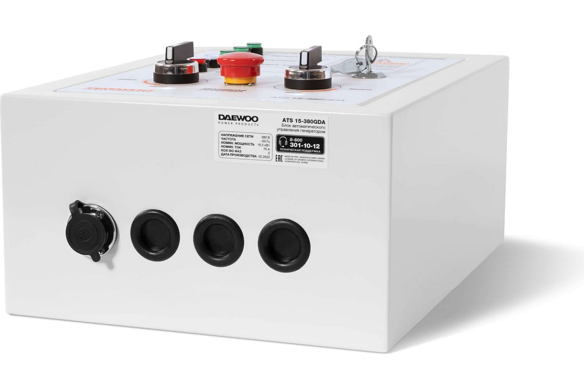 Блок DAEWOO ATS15-380GDA обеспечивает автоматический запуск бензиновых генераторов DAEWOO GDA 7500E-3, GDA 7800E-3 в случае падения напряжения в основной сети или прекращения подачи электроэнергии. При возобновлении подачи электричества автоматика переводит питание на внешнюю сеть и отключает генераторную установку. Блок автоматики имеет крепление для монтажа на стену. Частота тока сети - 50 Гц. Напряжение зарядки аккумулятора - 12 В. Длина кабеля управления - 2 м. Количество фаз - 3.
