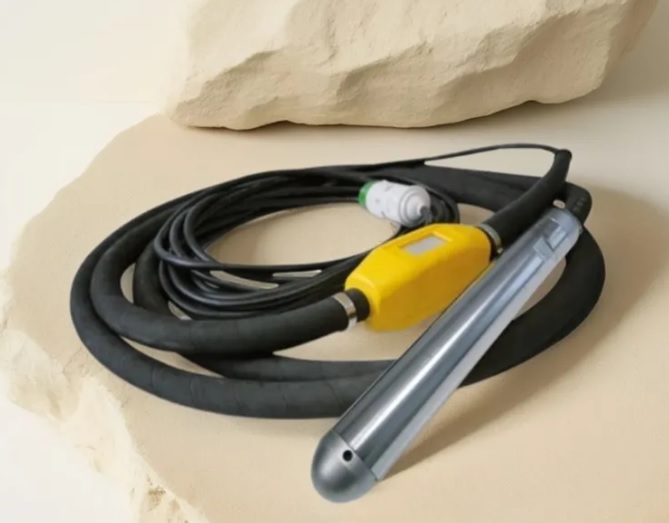 Вибратор оснащен системой защиты от перегрева и обладает классом влагозащиты IP 68. Комплект поставки включает гибкий вал длиной 5 метров, вибробулаву с интегрированным высокочастотным двигателем и электрический кабель с выключателем длиной 10 метров.